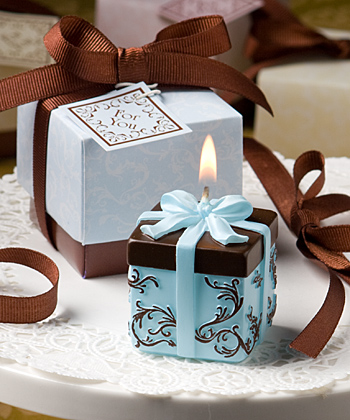 This attractive brown and blue Gift Box Collection candle favor makes a gift that’s destined to light up your guests’ day